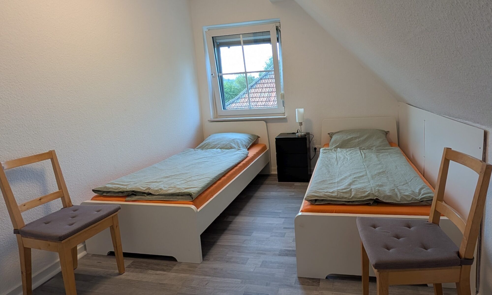 Egal, hier bist du richtig. Wir bieten dir eine gemütliche kleine Wohnung unter dem Dach für 1-2 Personen mit Doppelzimmer (Einzelbetten) Küche und eigenem Bad mit Dusche und WC.